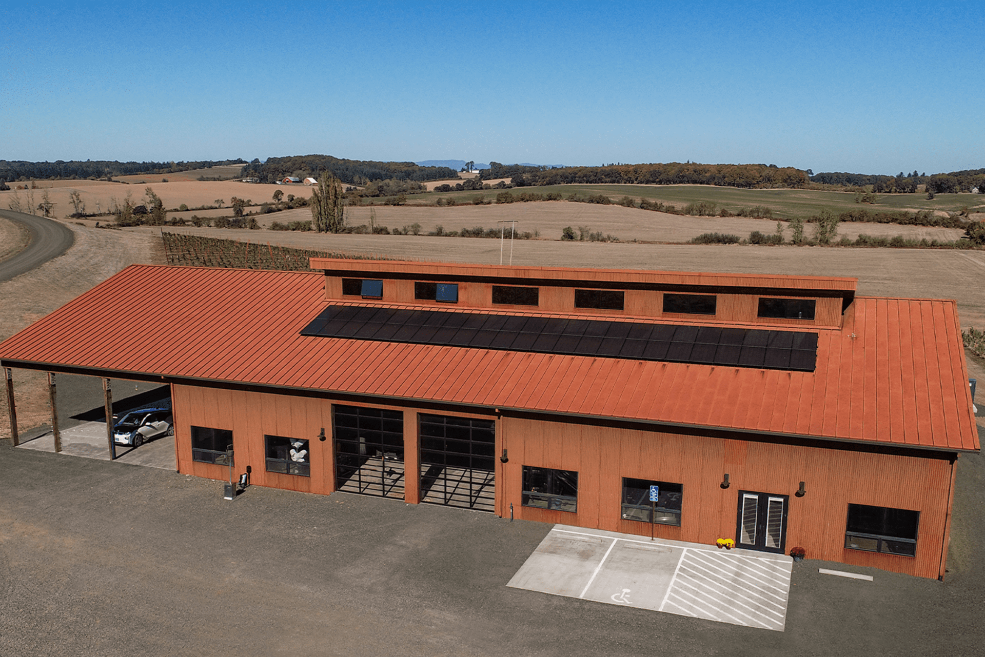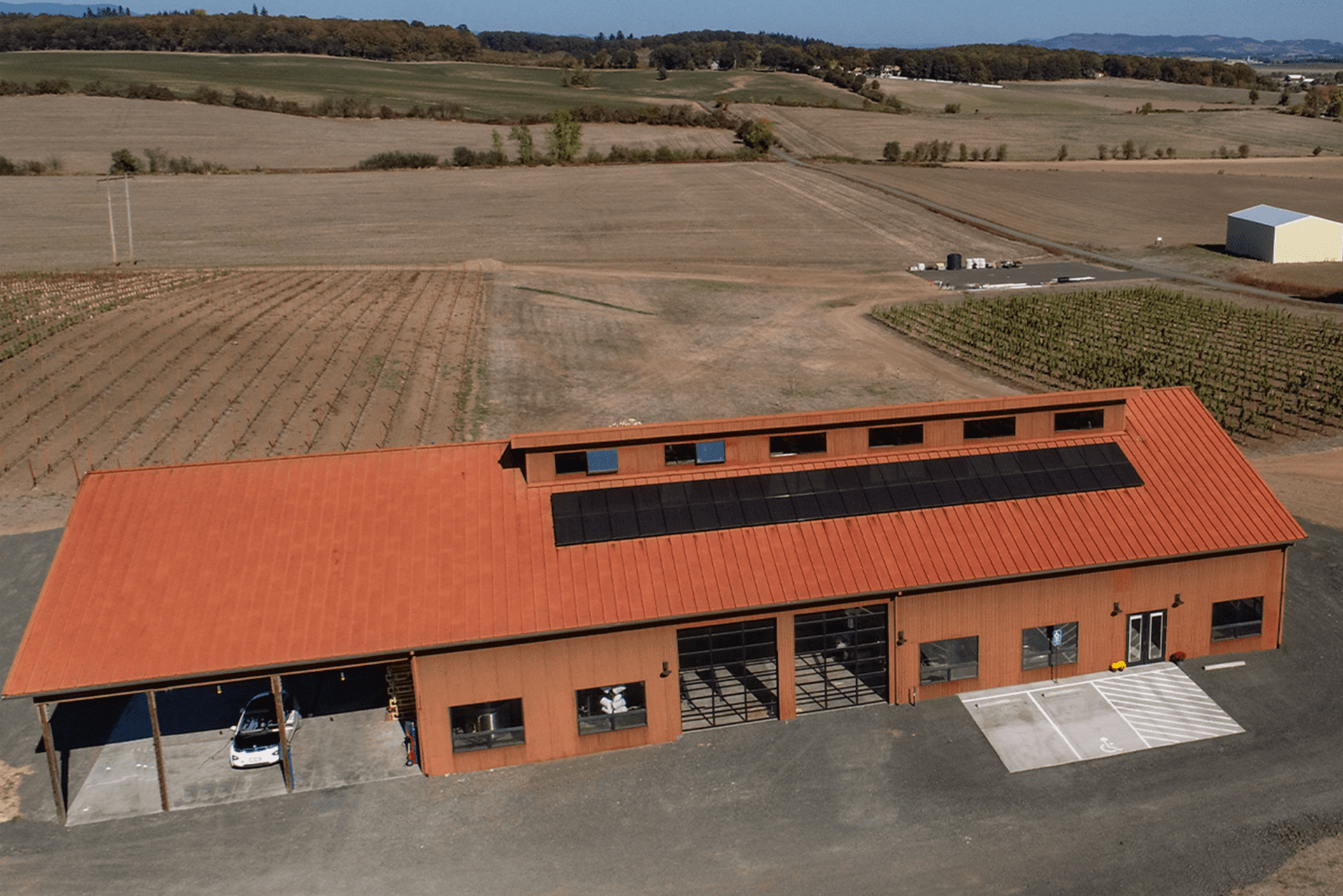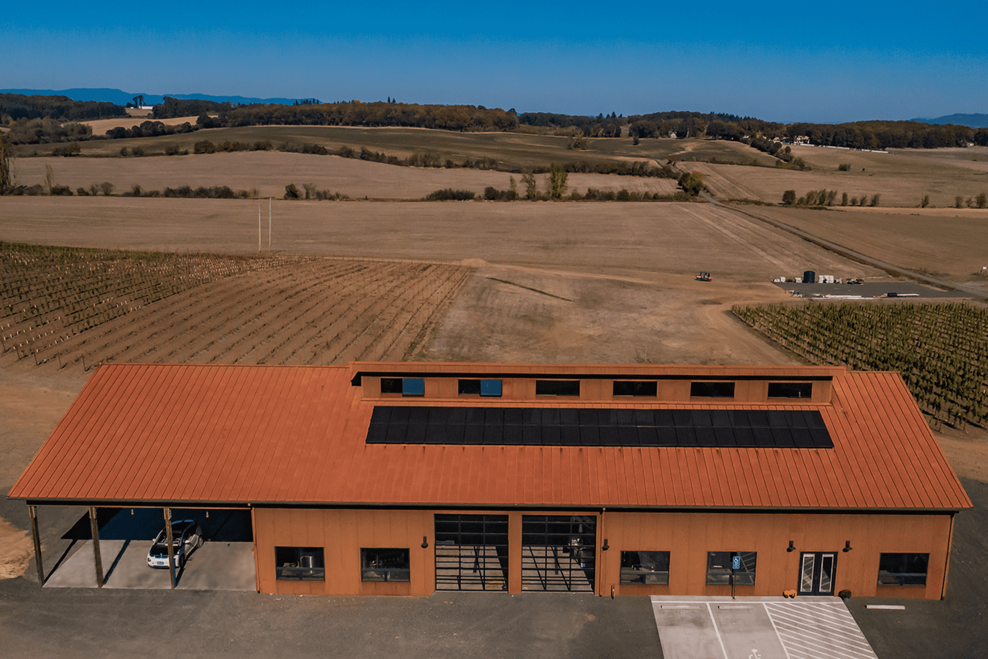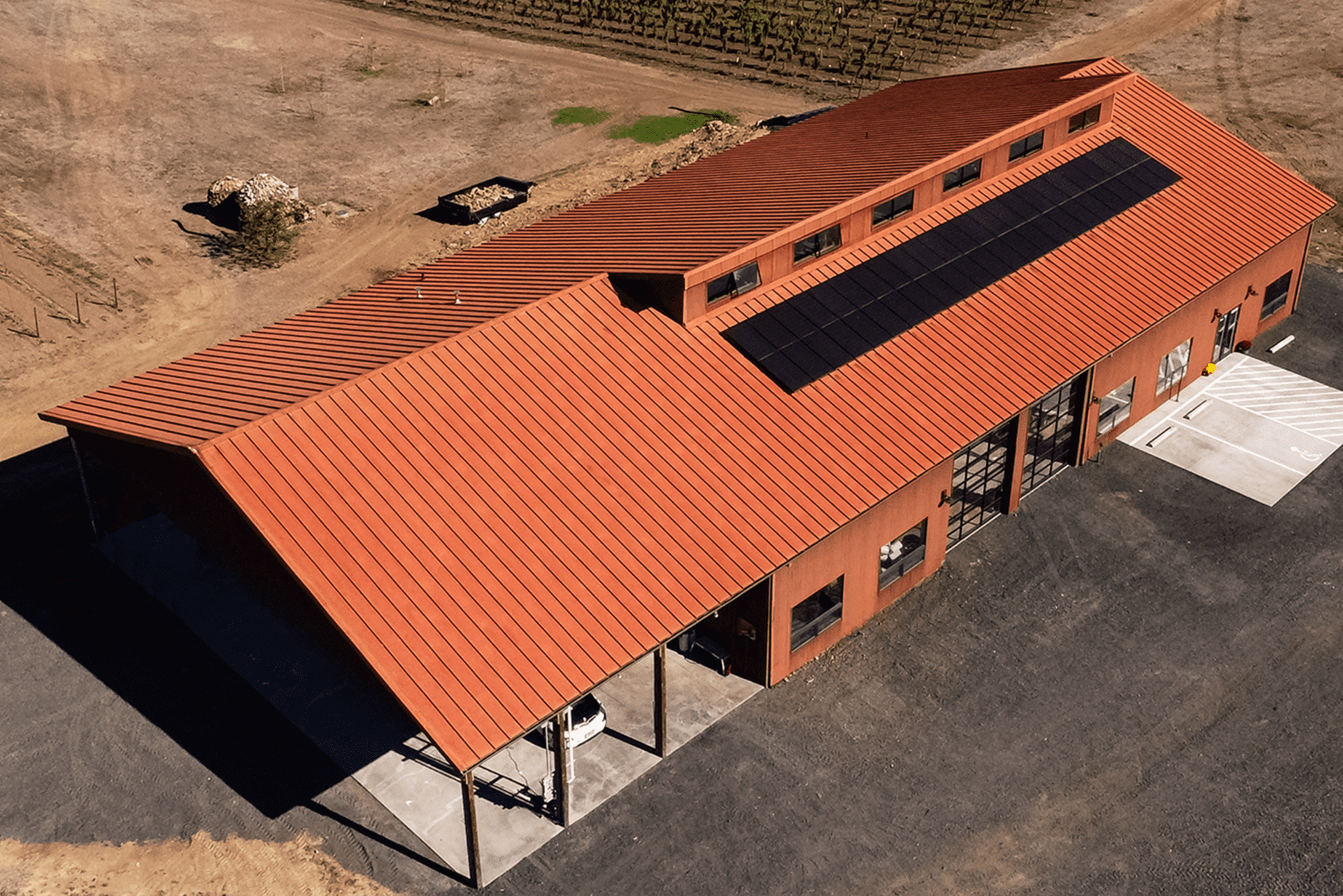 Andante Vineyard features Taylor Metal’s MS-200™ panel on the roof and Classic 7/8″ Corrugated™ on the siding. MS-200™ panel’s style is Flat Pan, the width is 18″ and the gauge is 22. Classic 7/8″ Corrugated™ width is 32″ and gauge is 22. The winery displays one of Taylor Metal’s weathering finishes on the roof and siding: Rusteel Plus™ which is an ideal choice for a historic, weathered look.