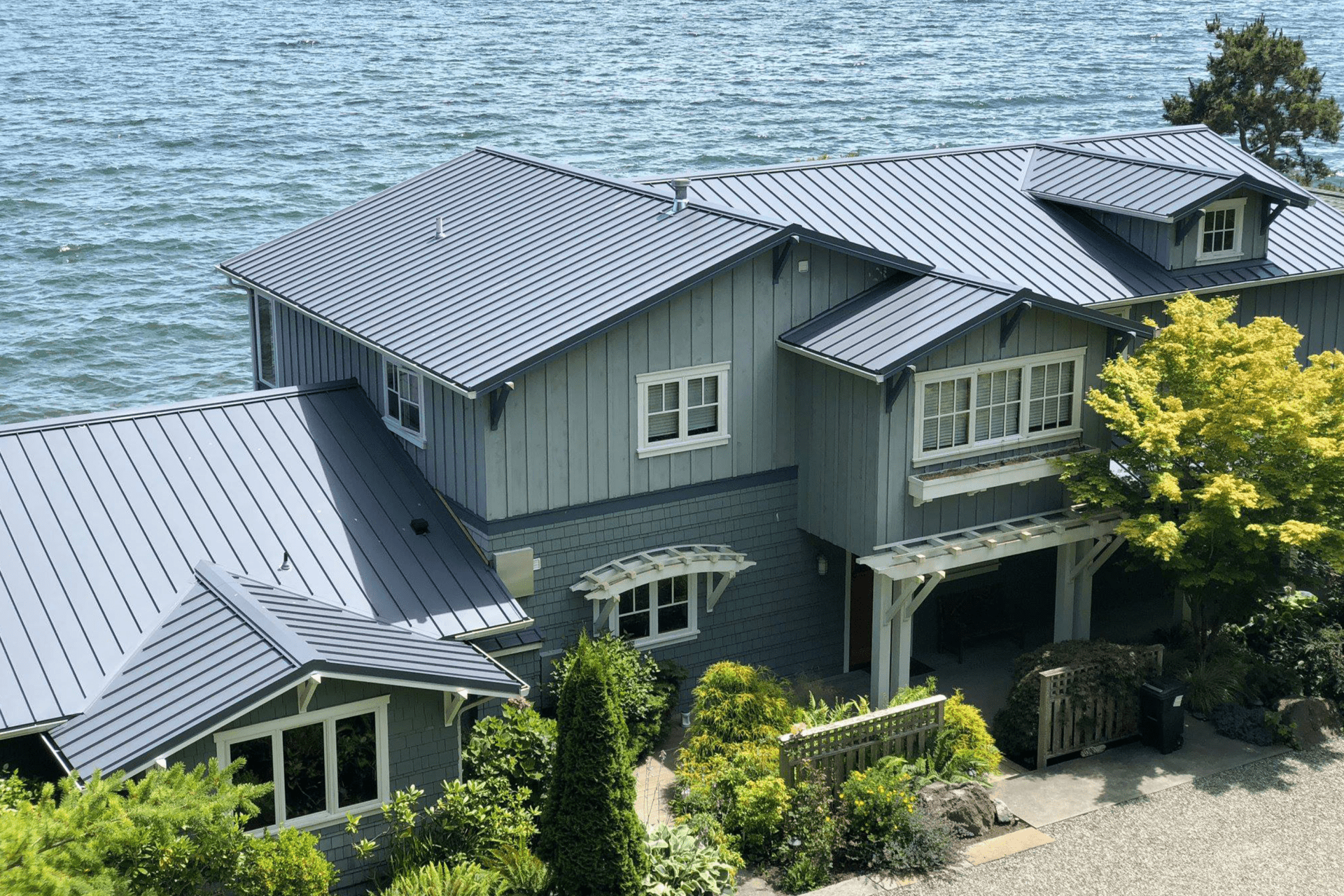 This residential home features Taylor Metal’s Easy-Lock™ Standing Seam panel on their roof. The panel has striations, gauge is 24, width is 12″ and the color is Charcoal Grey (Kynar 500®). Easy-Lock™ is the only metal roofing panel with a patented no-siphon dry lock seam, with a unique reversing feature to allow installation of panels from both directions – starting at any location.