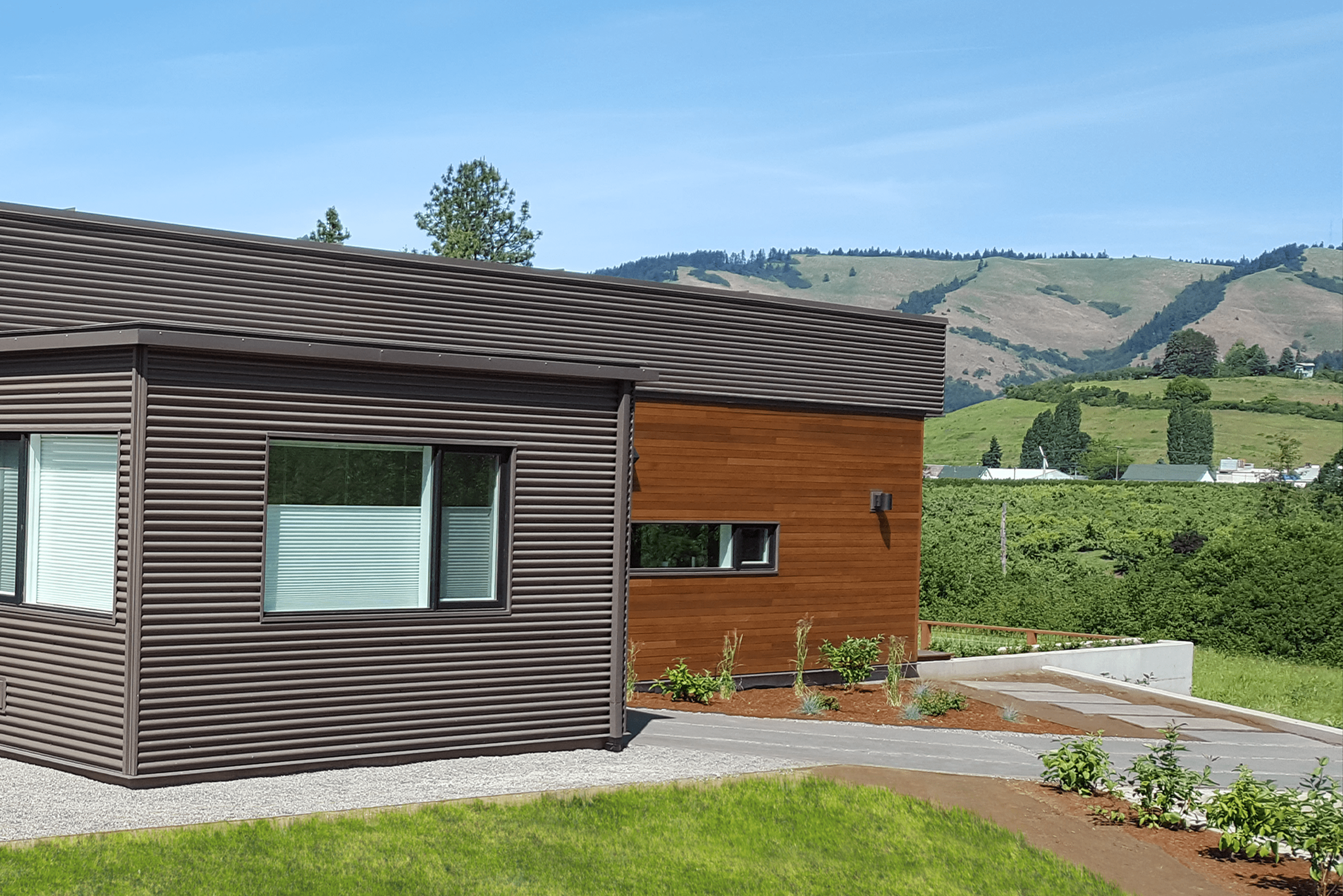 The Jones Residence features Taylor Metal’s Classic 7/8″ Corrugated™ panel. The gauge is 24 and the color is Dark Bronze (Kynar 500®). Classic 7/8″ Corrugated™ is an economical, structural, exposed fastener metal roof and wall panel. Deep corrugations allow for aesthetically pleasing shadow lines, making it an excellent choice for any application.