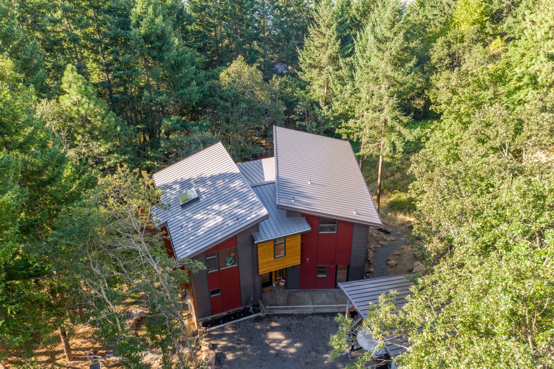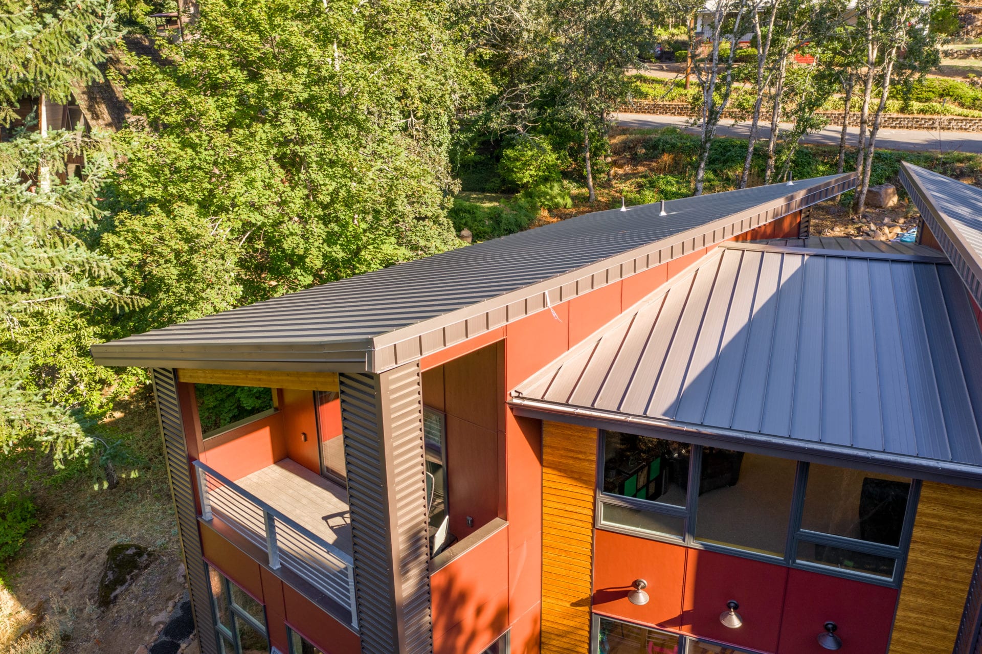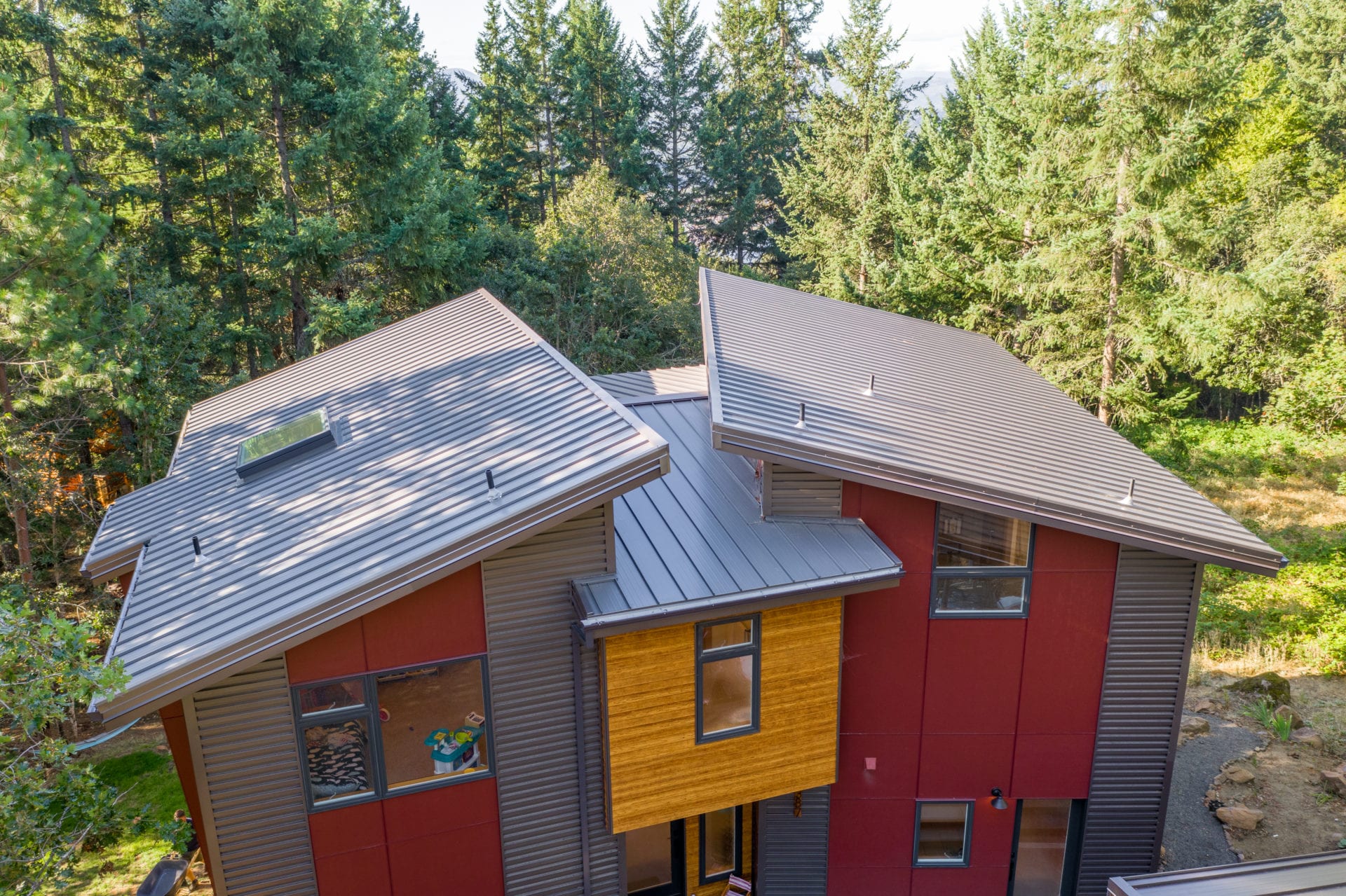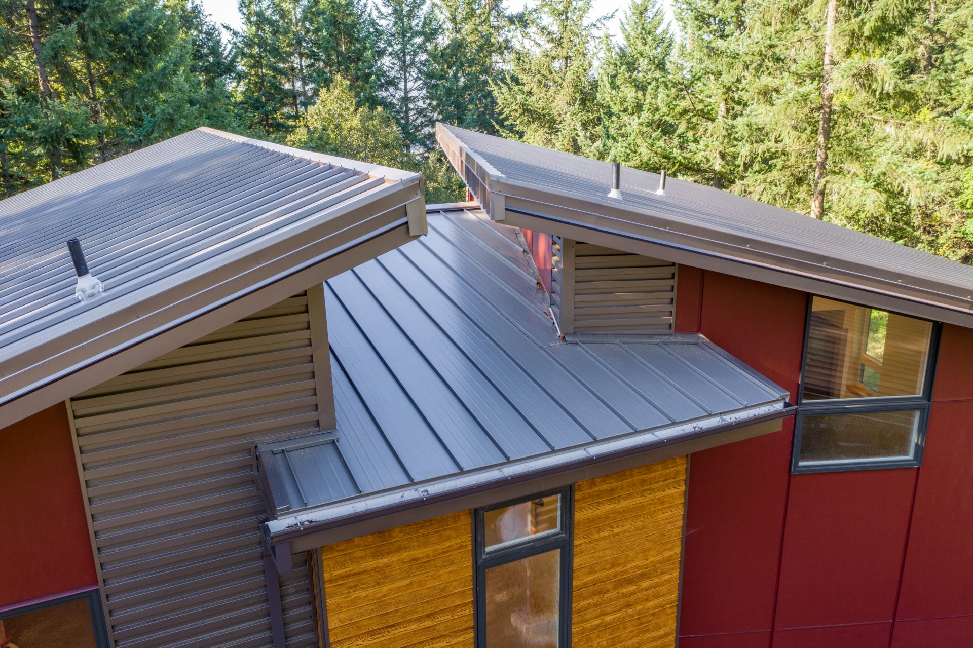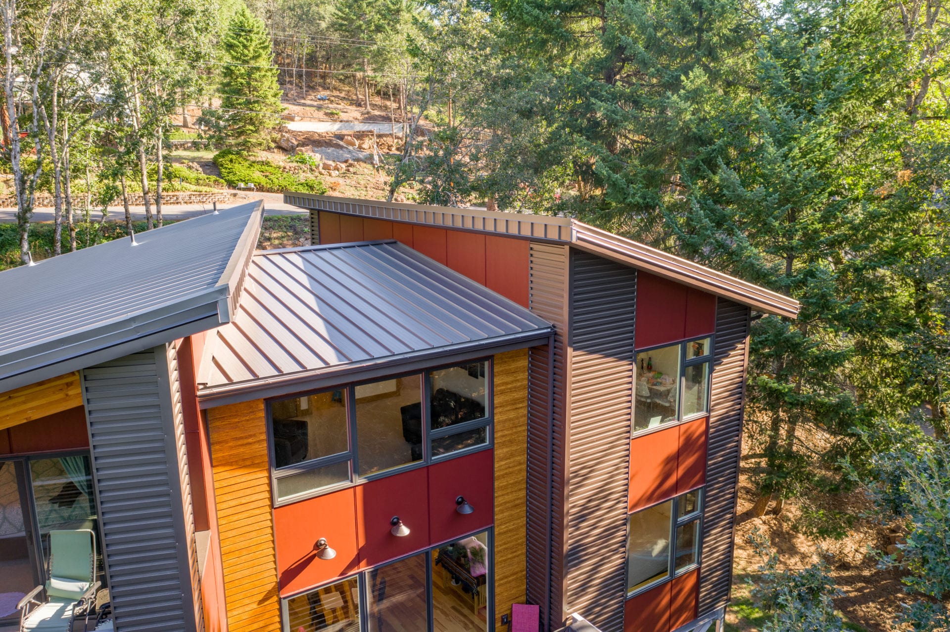 The Madsen Home showcases two of Taylor Metal’s panels! Easy-Lock™ Standing Seam with accent ribs and notching is the panel applied to the roof; the width is 12″, the gauge is 26, and the color is Weathered Zinc (Kynar 500®). The panel installed on the walls of the home is Contour Series™ C-5 panel, the width is 12″, the gauge is 24, and the finish is Vintage® (Kynar 500®). The garage next to the home also features Easy-Lock™ with accent ribs and notching on its roof; the width is 12″, the gauge is 24, and the panel finish is Vintage® (Kynar 500®).